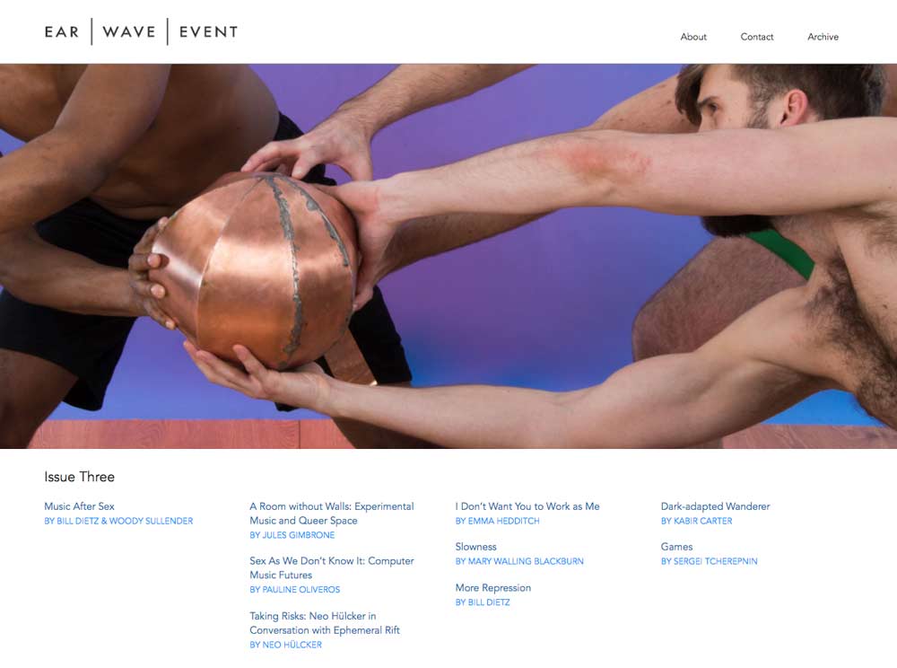 Ear Wave Event is a journal / zine / web publication co-edited with Bill Dietz (co-chair Music/Sound, Bard College MFA program). The publication largely focuses on the intersections of sound with larger arts practices. We have been frequently cited, and now appear in syllabi at Harvard and School of the Art Institute of Chicago among other institutions.