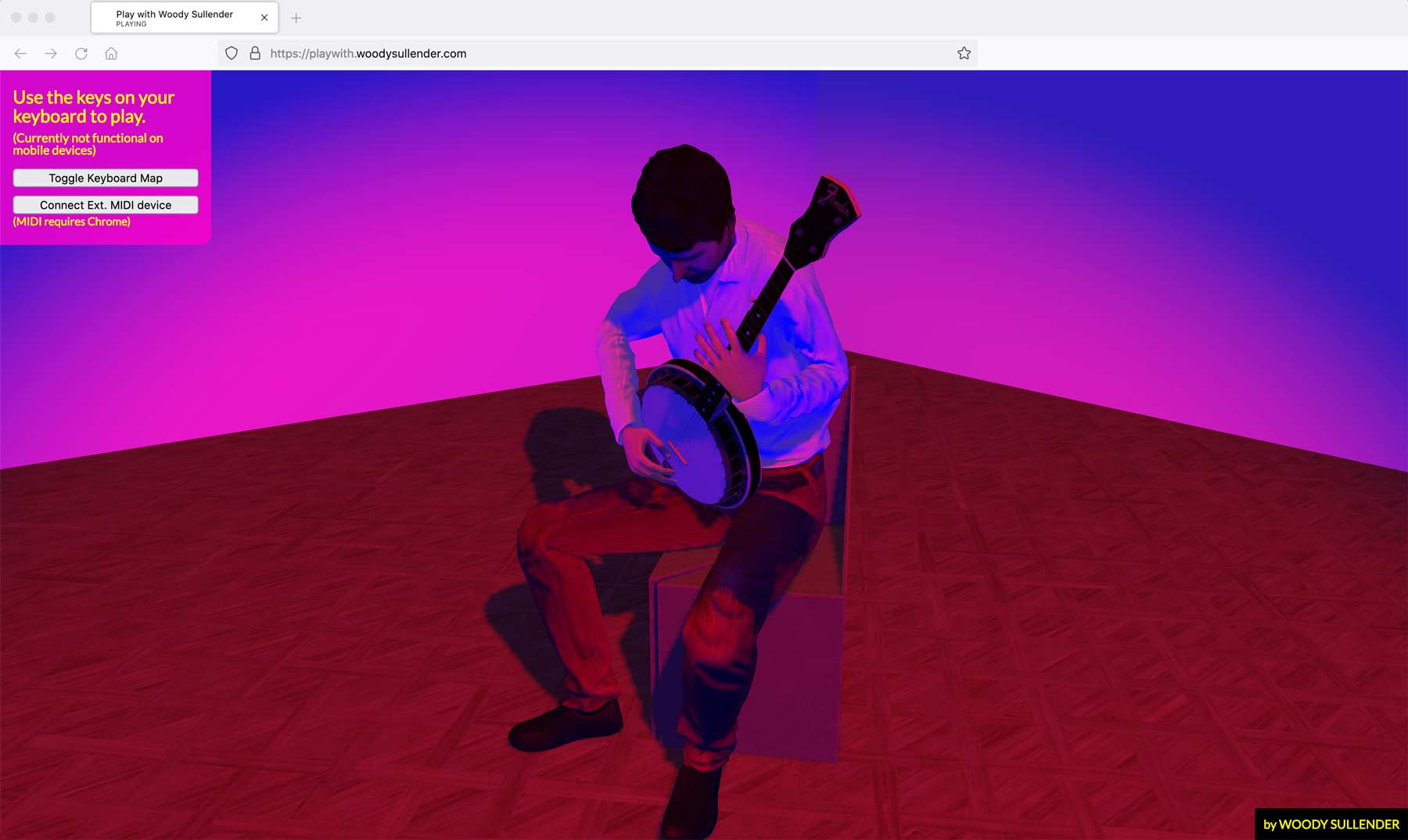 Through the site, the visitor can control this instrumentalist avatar as a unique banjo performer. The avatar responsd to both a normal computer keyboard as well as a velocity-sensitive MIDI keyboard.